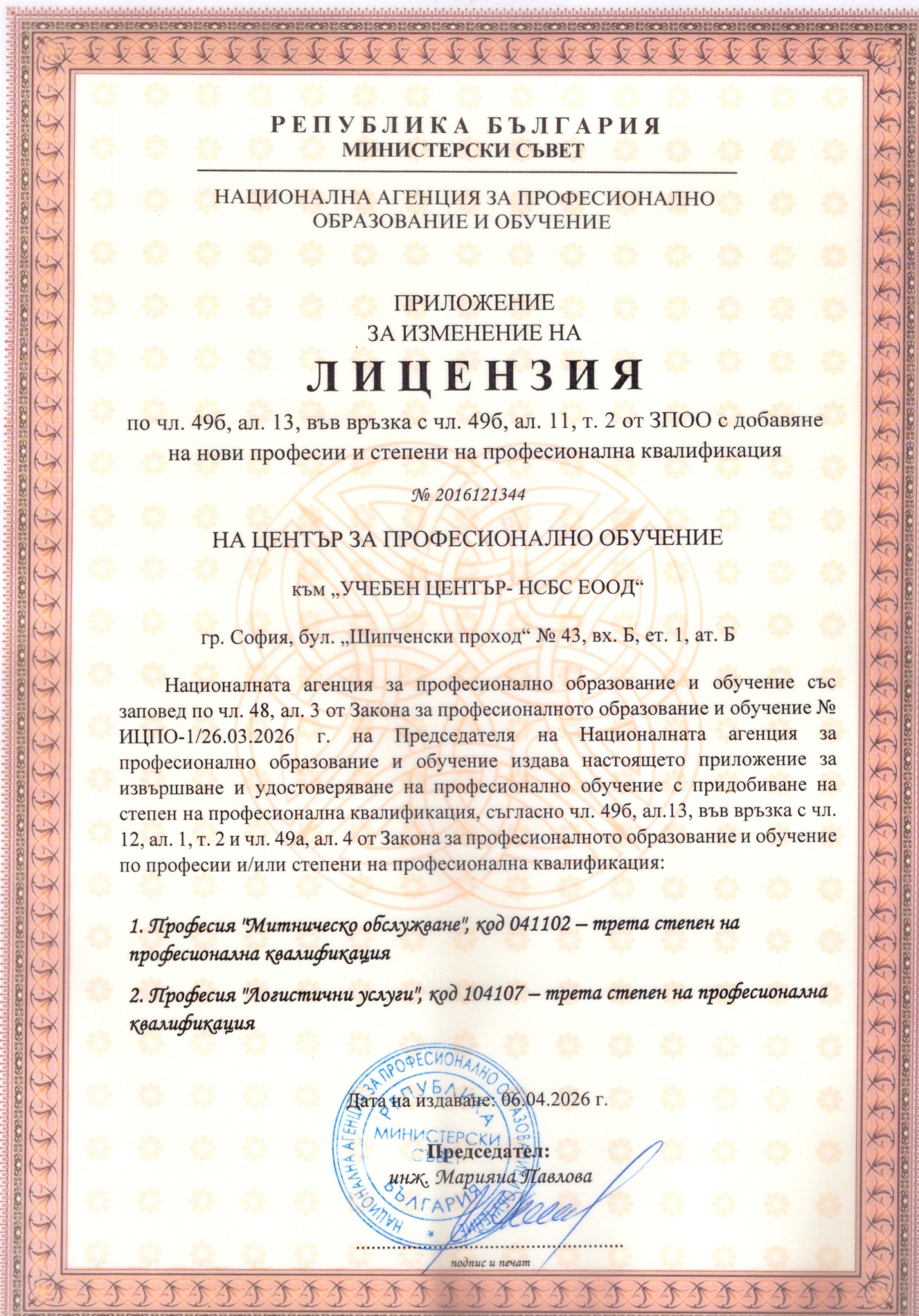 В края на м. март. 2026 г. на Учебен център - НСБС получи преиздаден лиценз № 2016121344 на НАПОО за провеждане на професионално обучение по още две нови професии „Логистични услуги“ и "Митническо обслужване" от Списъка на професиите за професионално образование и обучение.